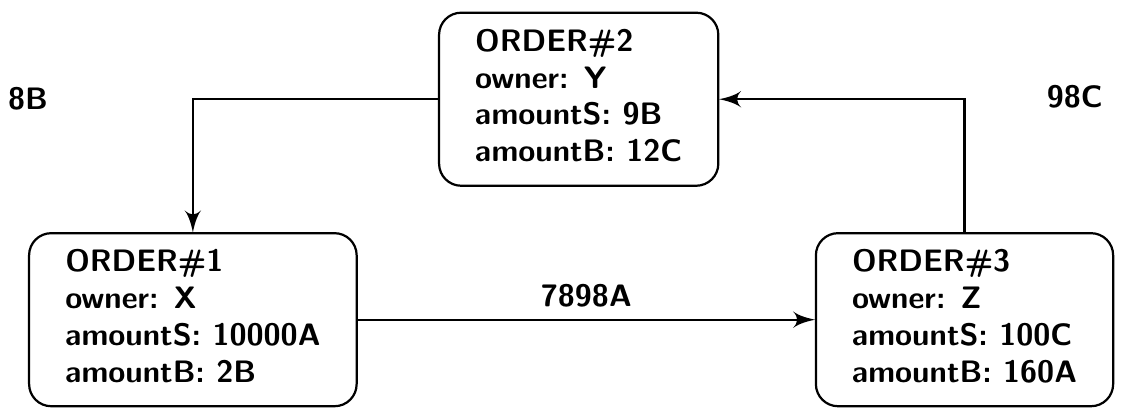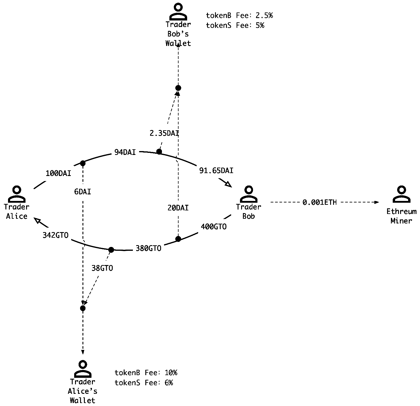 - • Relays/Ring-Miners: Relays are nodes that receive orders from wallets or the relay-mesh, maintain public order books and trade history, and optionally broadcast orders to other relays (via any arbitrary off-chain medium) and/or relay-mesh nodes. Ringmining is a feature – not a requirement – of relays. It is computationally heavy and is done completely off-chain. We call relays with the ring-mining feature turned on “Ring-Miners”, who produce order-rings by stitching together disparate orders. Relays are free in (1) how they choose to communicate with one another, (2) how they build their order books, and (3) how they mine order-rings (mining algorithms).